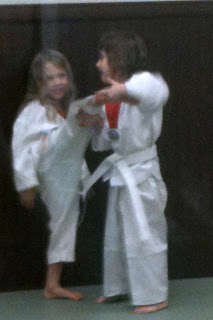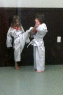 Sharon and I had no idea what to expect given Hallie's histrionics. But we decided to plow forward and signed a (month-to-month, just in case things did not pan out terribly well) contract with the martial arts studio. We were impressed by how much the instructor could tell about Hallie from a fifteen minute evaluation. We had divulged nothing on the paperwork other than the fact that she sometimes needs an inhaler before physical activities (this was most certainly the case this past week or so). But he had picked up pretty much everything: the low tone in her trunk and extremities; her right-side weakness (due to her left side grade I intraventricular hemorrhage), her tight heel cords (which are consistent with her undiagnosed but likely case of mild cerebral palsy (probably ataxic) and the like. But, even though she had trouble balancing on one leg and coordinating her movements, she did pass her z-mat. I told her the instructor about her issues (the extreme prematurity, the brain bleed, the low tone, the problems with auditory processing etc) ex post facto, and he seemed cool with it. My feeling is this: she may not be the most proficient martial artist out there, and that's fine. As long as this is good for her self-esteem, assertiveness, physical capacity, and social well-being, that's okay. Not everything is, or should be, a competition.